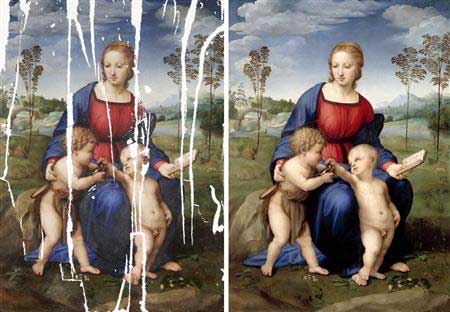 さて、今回のラファエロの「ひわの聖母」。修復と言うよりレタッチした感じ。写真で見る限りだいぶ違うように見えますが。