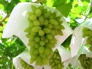 1つ目の理由は、レディーフィンガー(淑女の指)とも呼ばれるピッテロビアンコと言う品種のぶどうを勝沼の現地で買うこと。私はもう7~8年は勝沼町菱山にある『ヤマサ農園』さんで買うことに決めてます。ここは珍しい品種を置いてありますし、お店の人、特にメガネをかけた奥様がとっても親切にぶどうのことを教えて下さいます。今回もちゃ~んとゲットしてきました。何せ、ピッテロビアンコは9月上旬の一定時期しか販売しておらず、栽培自体が難しい品種なので意外と手に入れにくい上に、結構味のバラつきがあるので、農園選びは重要です。