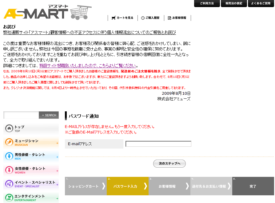 一応、登録したメアドとパスワードでログインしてみたらダメだった。どうやら案内の通り過去の登録情報は削除されてるみたい(としか言えない)。やっぱりライブが無いから通販でグッズを買う人って多いと思う。ちゃんとして欲しいなあ。応援団(ファンクラブ)の年間更新したばっかりだかし、再来週には原坊のシングルも出るしね。