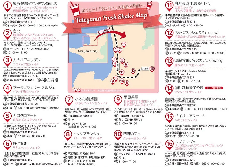 館山市内の 16店舗が須藤牧場で販売している「プレーンな味のアイスクリーム」をベースに、16種以上の異なる味の生シェイクを販売しています。
