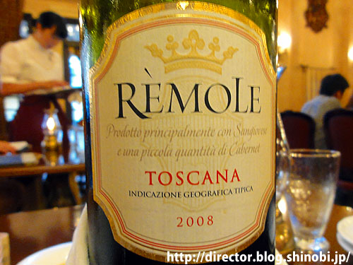 基本はピッツァ マルゲリータを食べることだが、この日のワインは少し酸味の豊かな中辛ワインと言うことで、イタリア・トスカーナ地方の赤ワイン"REMOLE(リモーレ) 2008"をセレクト。ベリー系のアロマと、ハーブや黒胡椒の香りがあり、サンジョヴェーゼ85%にカベルネ・ソーヴィニヨン15%が入ることで、酸味の中に若干の渋みを感じる、あまり酸味の強くない飲みやすいイタリアワインだ。