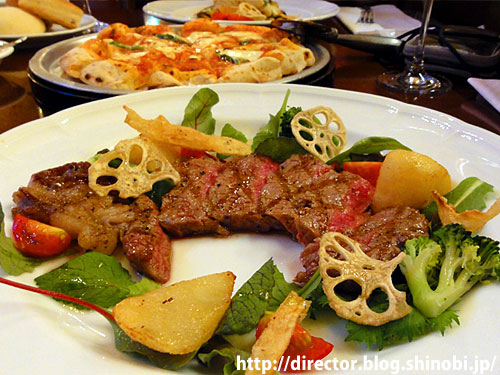 料理は、妻は"今日の魚料理"を、私は"肉料理"をセレクト。肉料理は"牛肉のサーロイン タリアータ ¥2,000円"。"タリアータ"は、表面はさっとあぶった赤身の牛肉で、ローストビーフと違って、オリーブオイルやバルサミコ酢などと和えてあり、さっぱりとして、噛めば噛むほど味が出る。付け合せは、レンコンやゴボウのチップに、ベリーリーフやポテトなど、ヴォリームはそれ程多くないが、ワインに合わせるにはトゥーマッチだ。