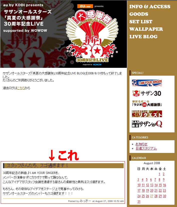 でも、読み返してみると、たくさんのSAS FAMILYが熱い思いを綴っていて、私も改めてあの夏の日を思い出しました。私も僭越ながら右上の画像のメッセージを書かせていただきました(LIVE BLOGでは「ここ」)。