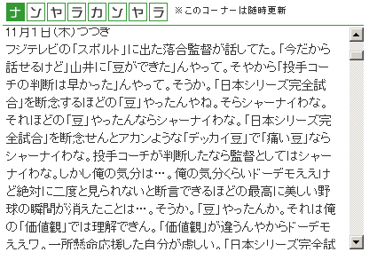 スポーツライターの玉木正之さんが、完全試合目前の山井投手を、九回に交代させたことについて批判したと言う記事。
