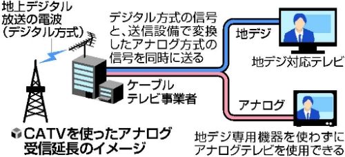 具体的には、地デジの電波をCATV会社でアナログ波に変換し、デジタルとアナログの両方の電波信号を家庭へ同時に送る。各世帯では、テレビが地デジに対応しているかどうかにかかわらず番組を見られる。