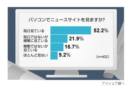 パソコンからニュースサイトを見る頻度を聞いたところ、全体の52.2%が「毎日見ている」、21.9%が「毎日ではないが頻繁に見ている」と回答。合わせると74.1%がパソコンのニュースサイトを頻繁に閲覧していた。(中略)
