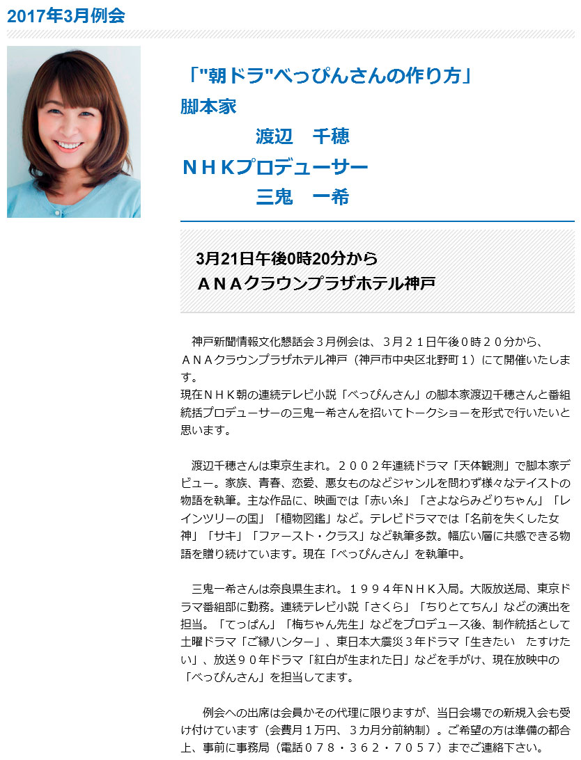 今月の21日に、渡辺千穂さんと三鬼チーフプロデューサーを招いて、神戸新聞主催の講演会があるらしいですよ。テーマは「べっぴんさんの作り方」。神戸新聞のナントカ講座の会員限定の講演会のようで、この2人の講演を聴くには、月会費10,000円×3ヶ月分を払わないといけないようです。そんな高いお金払って、誰が行くのでしょうね。