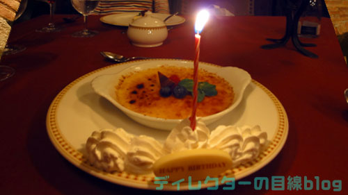 なお、この夜のディナー・コースのデザート『クレームブリュレ』がバースデー仕様になっていた。