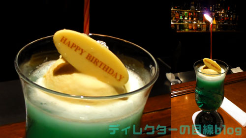 メニューにない隠れメニュー。因みに緑色は「抹茶」「メロン」等の緑色の好みのリキュールで作ってくれる。この夜は『MIDORI』(公式)と言うメロン・リキュールを選択。バーテンダーたちがバースデー仕様で、キャドルの炎を吹き消すと拍手でて祝福してくれた。