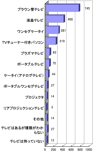 『自宅にあるテレビの種類を聞いてみた(複数回答)。最も回答が多かったのは「ブラウン管テレビ」の745人(74.43%)で、7割以上のユーザーはブラウン管テレビを所有しているようだ。(中略)昨年4月の調査では、ブラウン管テレビの所有者は8割を超えていたことを考えると、ブラウン管テレビ所有者は減少している』らしい。(japan.internet.com 2008年6月10日17:30付)