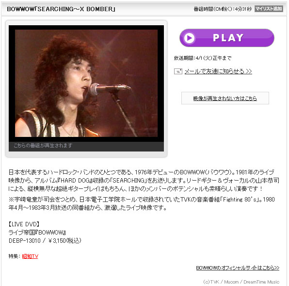 その中で1981年のライブ映像から、アルバム『HARD DOG』収録の「SEARCHING」が紹介されています。アルバムと違ったハードロックなアレンジですし、ベースはキンさんですからお宝物です。ライブ帝国としてDVD化されていますけど(苦笑)