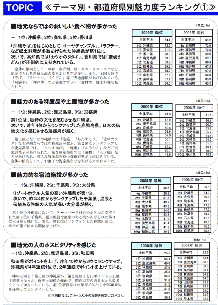 リクルート(東京)の旅行部門「じゃらんリサーチセンター」は29日、全国1万4千人の宿泊旅行者を対象に実施した「じゃらん宿泊旅行調査2009」の結果を発表した。それによると、全7テーマについて人気度を調べた都道府県別ランキングで、沖縄が「地元ならではのおいしい食べ物が多かった」など5テーマでトップに輝き、今回で4度目を迎える同調査で過去最多の首位獲得となった。