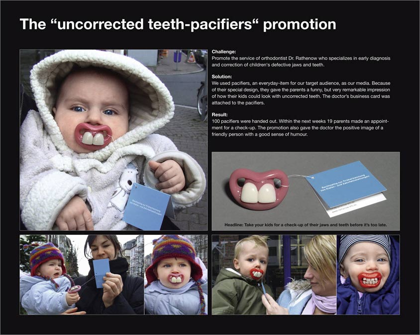 名刺には「Take your kids for a check-up of their jaws and teeth before it’s too late.(手遅れにならないうちにあなたの子供を彼らのあごと歯の検査と考えてください。)」と書いてあります。