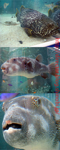 写真は1F屋外のソニースクエアで展示中の水槽。約40種類1000匹の魚たちが期間中に入れ替わり登場するらしい。写真上がサンゴ礁に生息する最も大きい硬骨魚類『タマカイ』、下2枚がサンゴ群落域に棲息する大型のフグ『モヨウフグ』。