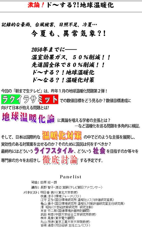 朝生(朝まで生テレビ!の略)では女性パネリストは田原氏にケチョンケチョンにされるのがオチだが、今回の枝廣淳子氏(環境ジャーナリスト)と亀山康子氏(国立環境研究所 温暖化対策評価研究室主任研究員)は最後までトンチンカンな発言だった。自分の主張をするのはよいが、討論番組だから司会者・田原氏の質問にきちんと答えないと、番組的に活用しにくいはず。特に枝廣氏は客観的な意見を装い、判り易い言葉で議論を幾度も後退させていた。ジャーナリストなら主張も大事だが、その方法論も考えるべきだと思う。