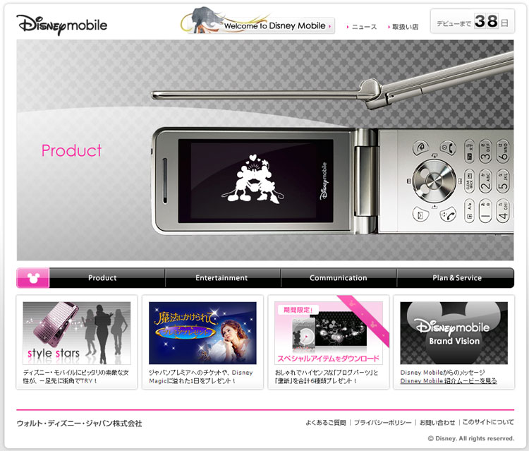 実はディズニーが携帯電話業界に参入するのは本国アメリカに次いで二回目。但し、前回は惨敗しました。今回は、その経験を生かしての意気揚々たる参戦でしょう。今回はいろんなディズニーの有料コンテンツが無料で使えたり、「@disney.ne.jp 」ドメインのメールアドレスが貰えたりといろいろ特典があります。