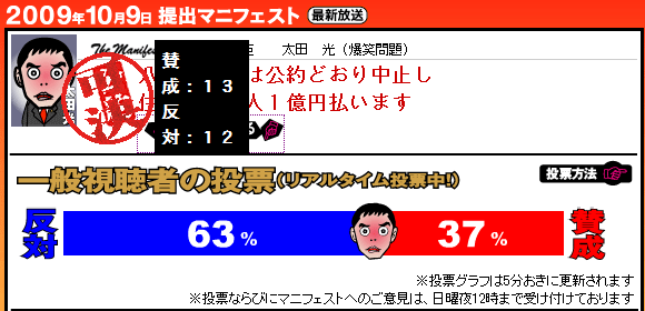 太田総理が「2億円じゃどう?」と言う言葉に、地元反対派の人が無反応だった。私は以前マンションの瑕疵問題で数年間デベロッパー等と闘い勝ったことがある。それと八ツ場の皆さんを同じには出来ないが、同じ苦労があると思う。それは一人でなく大人数で闘うことの難しさだ。自分やその家族だけなら「1億円もらえってもうこんなことに振り回される人生を終わりにしたい」、「お金をくれるなら何処かへ引っ越しても良い」言う人がいると思う。しかし、グループになるとその意見は言いにくい。その部分を表面化させる議論が今回の太田総理のマニフェストではなかっただろうか?
