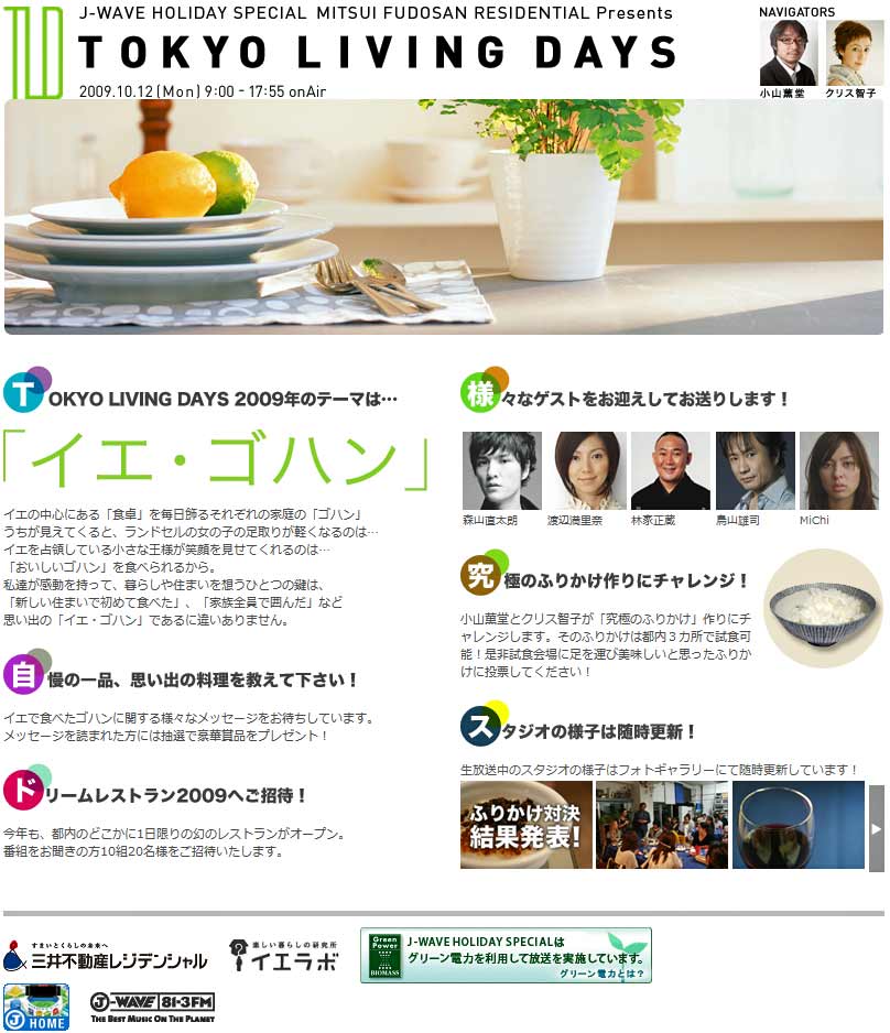 10/12放送のJ-WAVE『20th J-WAVE HOLIDAY SPECIAL TOKYO LIVING DAYS』は面白かったし、興味深かった。“ウマイ企画”と書いたのは番組スポンサーである三井不動産レジデンシャルを、本来“聴覚だけ”のラジオ番組に“味覚”を加えて、上手にPRした内容だからだ。