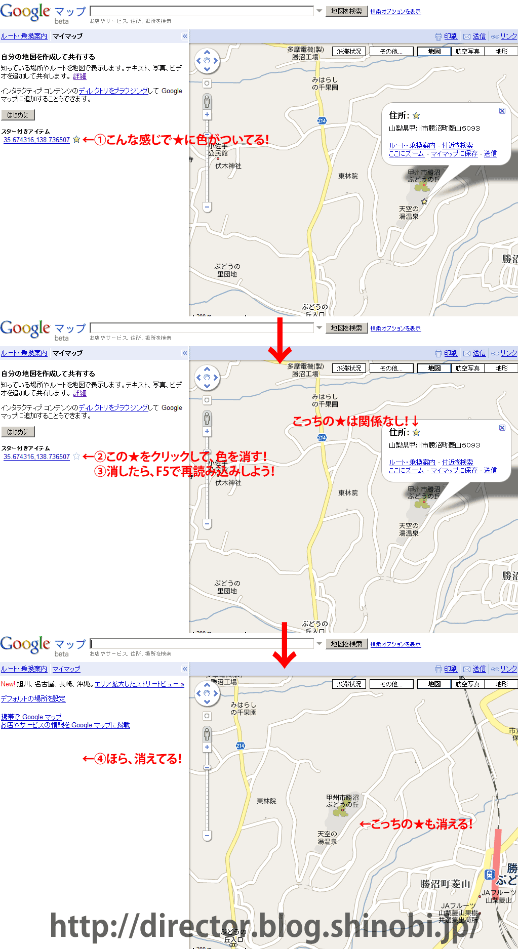 詳しくは左の画像をクリックして拡大画像を見て頂きたい。簡単に言うと、左のメニューバーにある★印をくりっくして色を消したら再起動だ。右のマップ内の吹き出し?の中の★印は影響しないようだ。