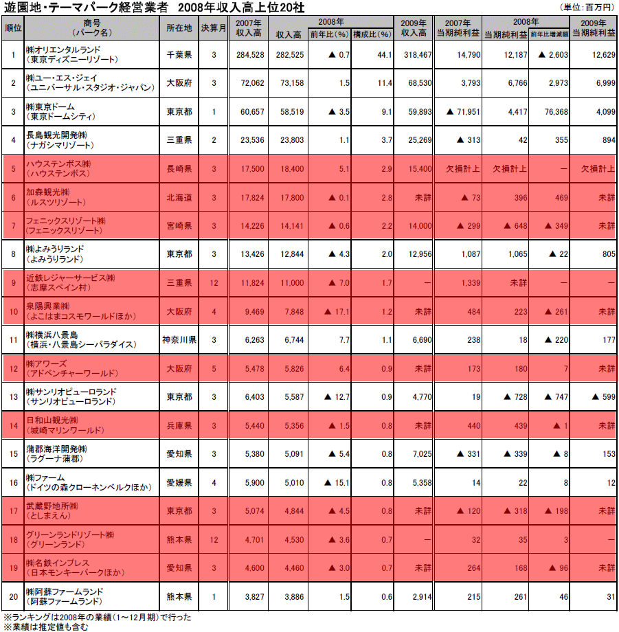 帝国データバンク、遊園地・テーマパーク経営企業112社の実態調査、08年収入高合計は6409億1300万円に