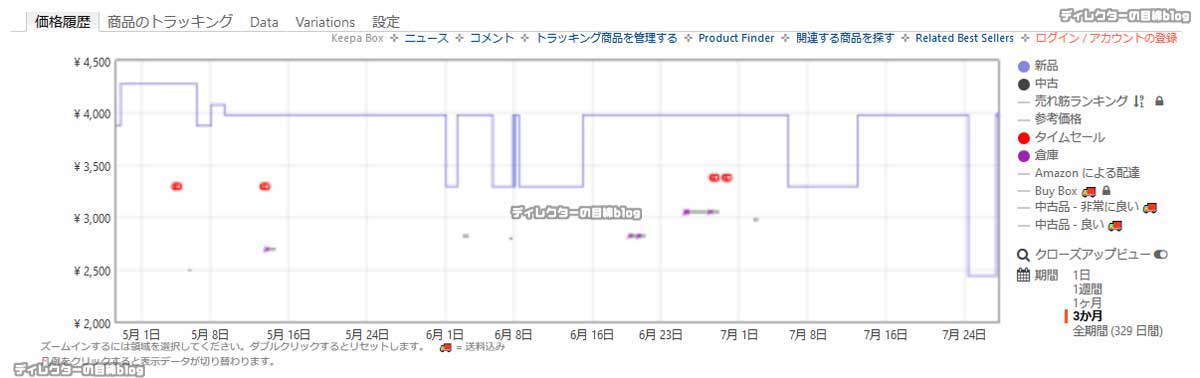 また、表の中の「赤い丸=タイムセール」なので、凡そタイムセールが次にいつ頃に来るか? も予測できます。更に表の外側の右下には、表示させる「期間」を「1日」「1週間」「1ケ月」「3か月」「全期間」と選べるので、その都度変えて状況を見ていると、安くなる頃が見えて来る…と言うわけです。
