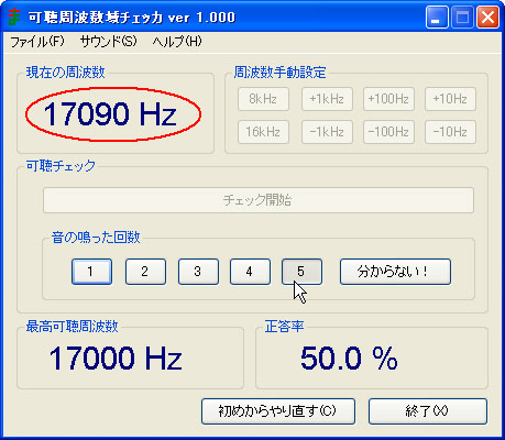 また、自身の聴覚の劣化?を簡単に調べる無料オンラインソフト「可聴周波数域チェッカ」もあります。また、「いろいろな周波数(可聴周波数などの実験)」サイトには、15Hz~22,050HzのWMAファイルが置いてあります。