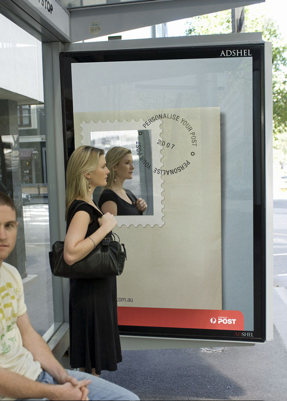 調べてみると「Peronalise」がどうやらイギリス英語らしく、米語的には「Personalised your post.(あなた個人のための郵便局です)」って言う意味みたいです。そうなると、この広告の意図が良くわかります。切手の部分が各ユーザになるわけですから。これがパス停にあるとちょっと不気味ですが、日本よりも外国のバスは不規則でしょうし、身だしなみに気をつかう時間もその分長くなるので実用性もあって良いと思います。