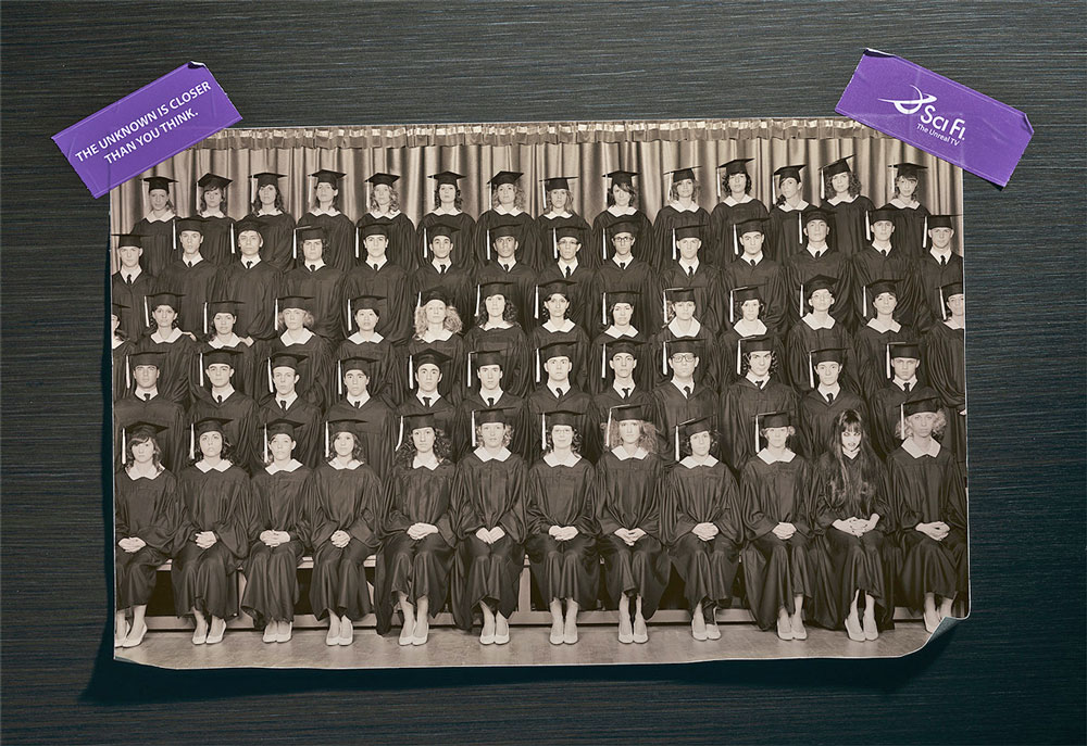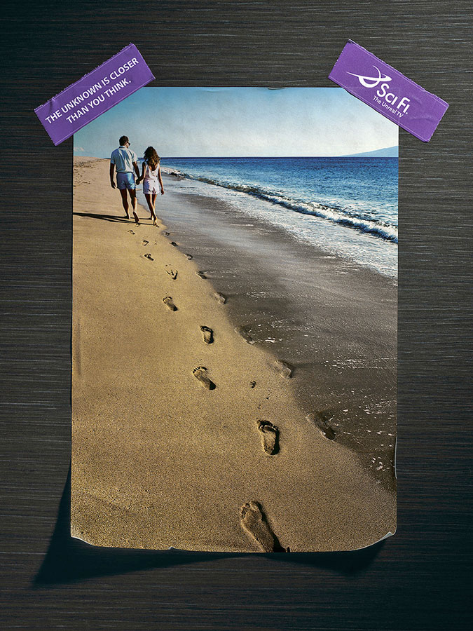 コピーは「The unknown is closer than you think. SciFi. The Unreal TV.(未知の世界は、意外と身近にある。SciFi。非現実的なテレビ」。3枚の広告中の写真をよく見ると・・・