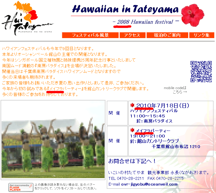 何より『ハワイアンフェスティバル in 館山(2010年公式サイト)』を観て欲しい。TOP画像が"2008"のまま。実はこのイベント、昨年の第9回までメンバーは若干変更されているが、基本的に住民中心の実行委員会方式で運営されてきた。それが、今年から南房パラダイスなどを運営する地元の巨大観光企業・株式会社オーシャンヴェール館山の運営となった。この事は地元紙・房日新聞『夏彩るフラダンスフェス 南パラで18日』に記載がある通り。それほどの企業がなぜ?