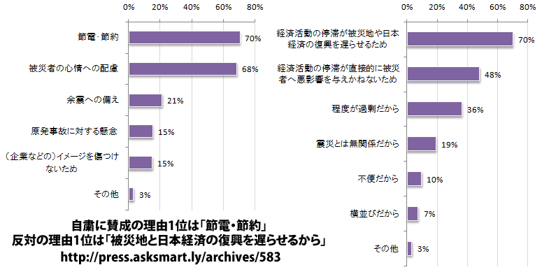 アスク・スマートリー ニュース(公式)が“東北関東大震災の影響を受けて多方面で「自粛」が行われていることについて、自粛に賛成する理由と反対する理由をそれぞれ聞いた”に興味深い調査結果があったので紹介する。