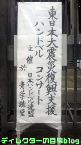 先日の7/31(日)午後に、青山学院講堂で開催された『東日本大震災復興支援ハンドベルコンサート』(公式)に行って来た。今回は、グレイス・ハンドベル・クワイア、ALPHA、クリノン・ハンドベル・クワイア、アンダンテの4チームが一堂に会しての珍しい演奏会だった。
