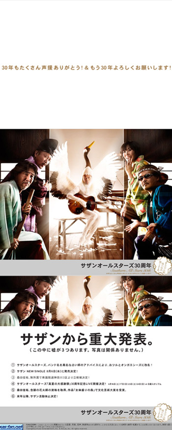 事務所関係者によると、1月にメンバーが集まった際、桑田らは「サザンという看板に頼らないで、サザンの活動だけをあてにしないで視野を広げていこう」と話し合ったという。桑田は「放電ばかりしてきたから、少し充電もしたい」と笑って話す一方で「サザンという屋号をおろすことは絶対にない」。さらに「メンバーがサザンの枠にとらわれず、現状に甘えず、さらにステップアップして戻って来られたらすてきだと思う。だから、いったんサザンの屋号を、このバンド名をファンに預けたい。そして、必ず受け取りに帰る」と語ったという。(日刊スポーツ記事より)