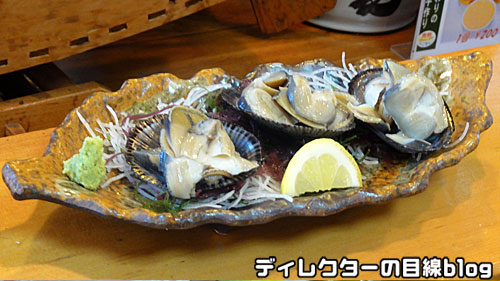 続いて『カサガイの刺身』。釣り人なら磯によくへばりついてるアレ。これでも立派な巻貝の仲間。歯応えが合って、レモンとワサビでさっぱり頂いた。