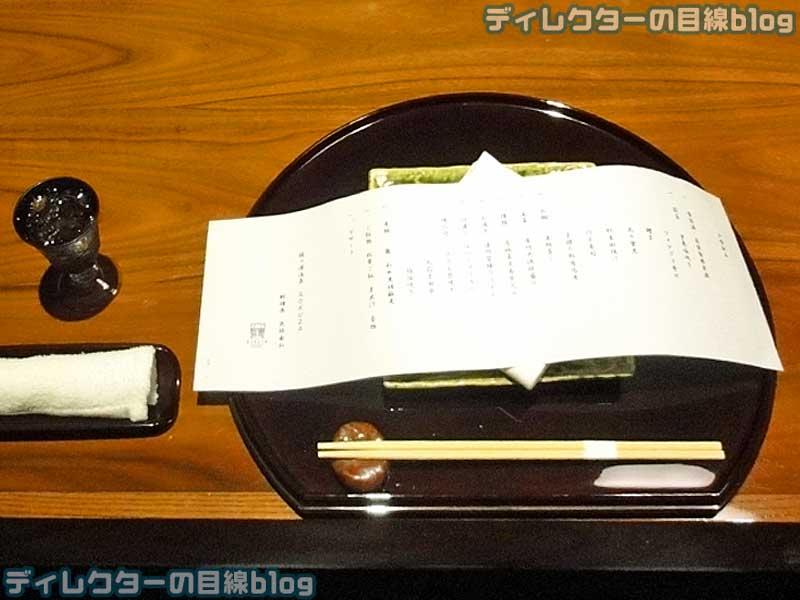 - 夜:焼八寸:さざえ壷焼き、丸茄子田楽、鱸塩焼き