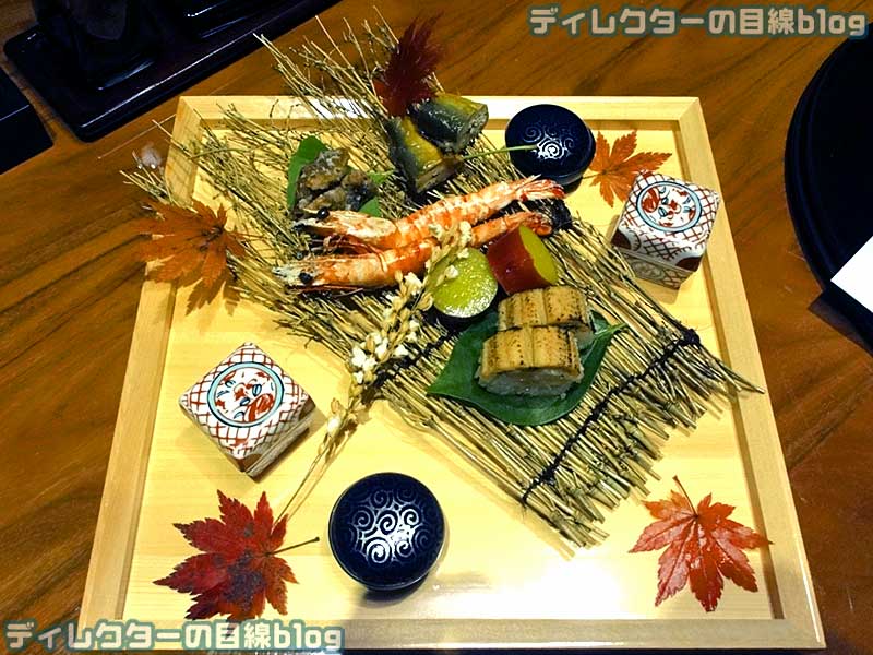 - 夜:前菜:才巻塩焼き、フォアグラ寄せ、鱧子、九十蜜煮、鯨竜田揚げ、穴子寿司、子持ち鮎有馬煮