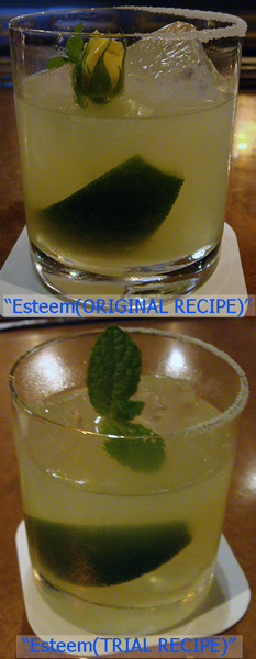 すると、母の日のオリジナル・カクテル『スヴニール』と、父の日のオリジナル・カクテル『ダディ』が評判が良かったので、発売期間延長が決まったそうです。そこで、キャストさんに「ノンアルコールのエスティームは作れないの?」と聞いたら、「材料が既に無いものもありますが、それでも宜しければお作り出来ます」と言ってくれました。オリジナル・レシピと異なるのは、プレミアム・グレープフルーツ・ジュースが通常のグレープフルーツ・ジュースになる点と、ミニ薔薇のデコレーションが無い点の二つ。