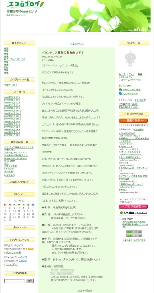 そんな中で、今回の沙耶さんのblog(こちらも)は正に決定打って感じです。自身の営利目的のためのカフェオープンのために、沙耶さんに共感する人やファンや地元の人に無料で手伝ってもらうと言うのもどうかと思うのに、その人たちを「ボランティア」と呼んで20日間もテント暮らしして下さい、とはひどすぎます。ちゃんと収入があるんだから、エコ住宅を建てた小山建築工務株式会社さんにお金を払って頼めば良いのに。