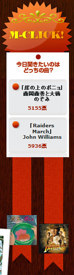 番組の最後にフルコーラス流す曲をリスナーの投票によって決めるコーナー。毎週2曲がジョン・カビラ氏から選ばれます。そして、今日の2曲が、宮崎駿監督アニメ映画「崖の上のポニョ」の主題歌で藤岡藤巻さんと大橋のぞみちゃんが歌う「崖の上のポニョ」と、スピルバーグ監督の大ヒット作品「インディ・ジョーンズ~クリスタル・スカルの王国~」のテーマ曲でスピルバーグ監督作品の殆どを手がけるJohn Williams作曲「Raiders March」。
