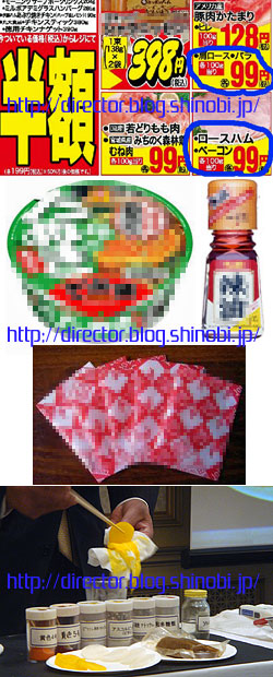 左のチラシ画像を見て「おかしい?」と思いますか?そう、おかしいんですよ。ハムが100gで98円で、その原料である豚肉も100gで98円。(※単純に考えて下さい。)加工品の方が安いはずありません。では、なぜ安いのか。150種類以上の食品添加物を入れて、原産国の人も食べないようなクズ肉でハムを作るからです。その理由は。
