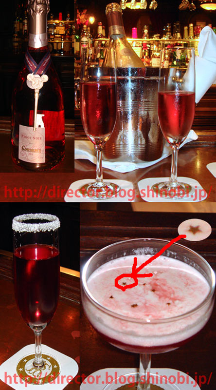 右側のショート・スタイルは『クリスマス・ローズ』。アップル・ブランデーとも言われるカルバドスをベースにイチゴやアップル・ジュースを使い、生クリームをフロート。更に星型の金粉が散りばめられています。こちらは結構甘口です。食後種に良いくらい。クラッシュド・アイスを入れたロックグラスに入れて飲むのも良いかも知れません。
