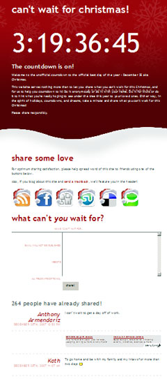 それを実感、共感できるのが、今回紹介する「cantwaitforchristmas.com」というサイト。左の図のようにサイトの上部には12/25までのカウントダウン表示。そして、ただ「クリスマスまで待てない」想いを書くだけのサイトですが、コメントを読んでみると欲しいものなどいろいろ書いてあって面白いです。「クリスマスまで待てない」ということだけで世界中の人がつながるのも面白いアイデアだと思います。